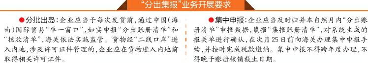 《規(guī)定》所稱“分批出島、集中申報(bào)”(簡稱“分出集報(bào)”),是指海南自貿(mào)港“零關(guān)稅”貨物及其加工制成品、享受加工增值免關(guān)稅政策的保稅貨物、自境外進(jìn)入海南自貿(mào)港時(shí)放寬貿(mào)易管理措施貨物及其加工制成品經(jīng)“二線口岸”進(jìn)入中華人民共和國關(guān)境內(nèi)其他地區(qū)(以下簡稱內(nèi)地)時(shí),企業(yè)可先分批辦理貨物實(shí)際出島手續(xù),再在規(guī)定期限內(nèi)向海關(guān)集中辦理報(bào)關(guān)手續(xù)的通關(guān)模式。