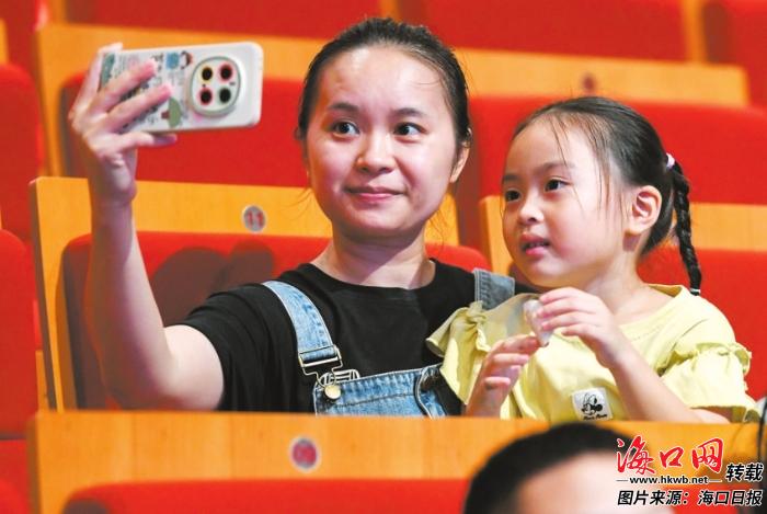 10月12日,在海南省非物質(zhì)文化遺產(chǎn)展示中心,家長陪同孩子前來看劇,并在開場前自拍。記者 蘇弼坤 攝