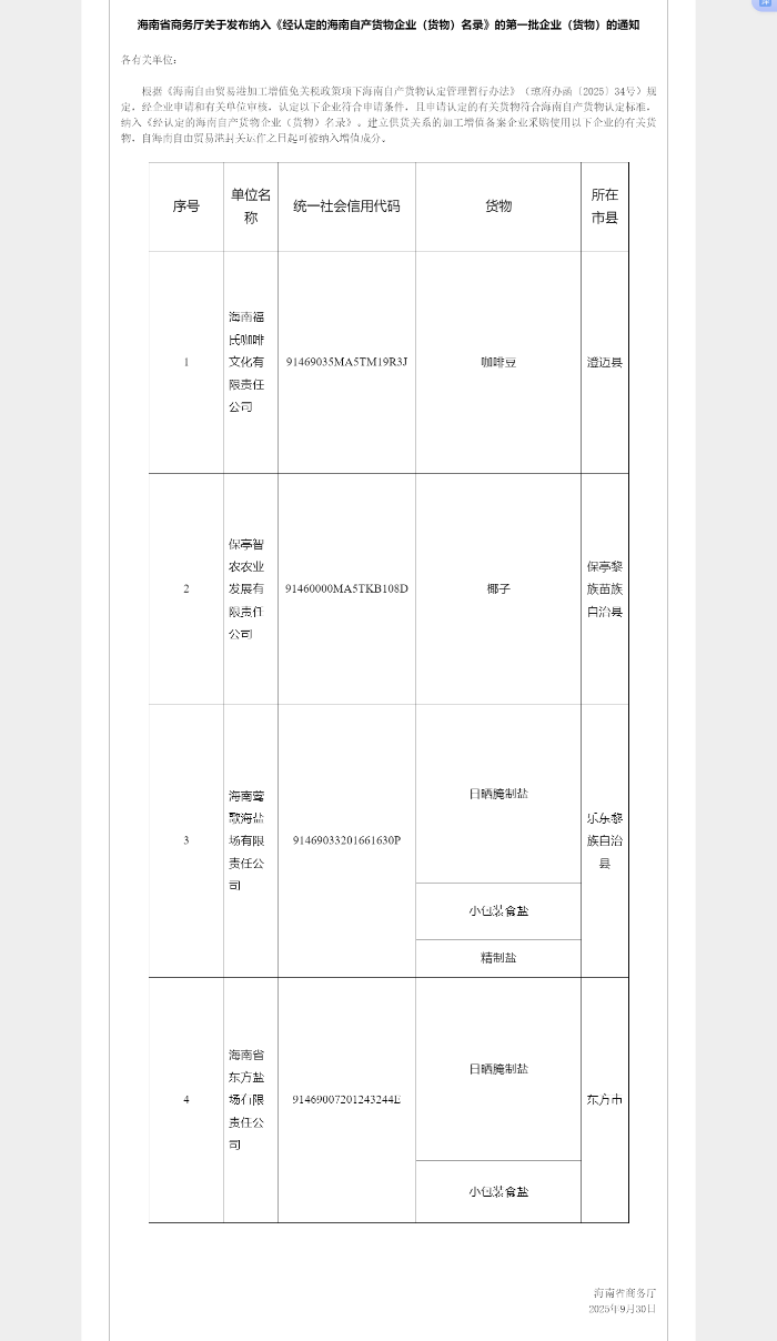 首批納入《經(jīng)認(rèn)定的海南自產(chǎn)貨物企業(yè)(貨物)名錄》的企業(yè)(貨物)為海南福氏咖啡文化有限責(zé)任公司(咖啡豆)、保亭智農(nóng)農(nóng)業(yè)發(fā)展有限責(zé)任公司(椰子)、海南鶯歌海鹽場(chǎng)有限責(zé)任公司(日曬腌制鹽、小包裝食鹽、精制鹽)、海南省東方鹽場(chǎng)有限責(zé)任公司(日曬腌制鹽、小包裝食鹽)。